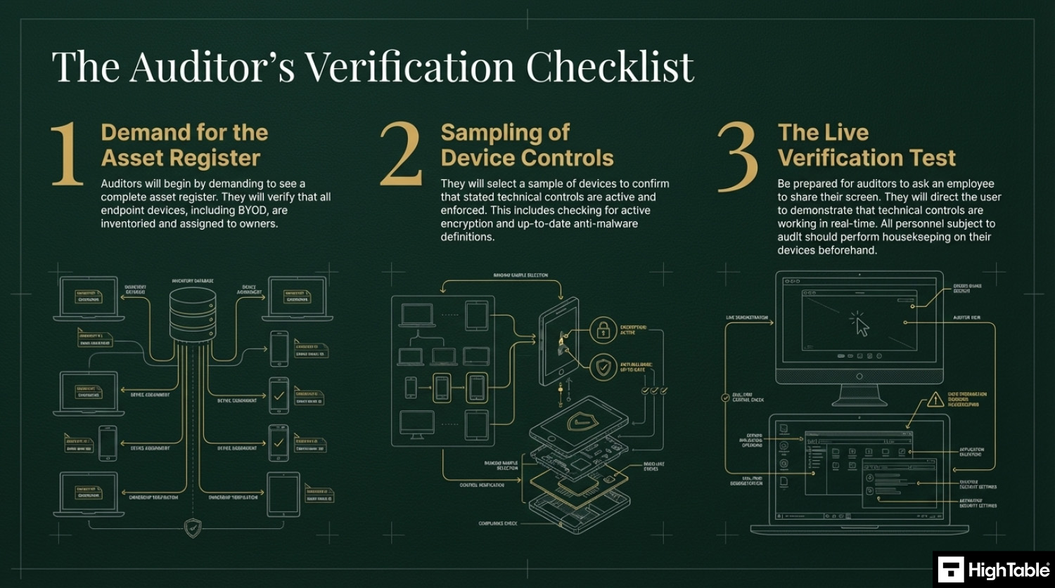 The auditor is going to check that all the appropriate controls are on the end point device with the usual ones being antivirus and encryption. The SOA and the in scope controls is the starting point and specifically the technical controls that you have said are in scope. They want to see that these are checked periodically with evidence of the checks and they also want to see what you do if the checks fail, with evidence of an example of that. This is covered in more depth in ISO 27001 Annex A Control 5.9 Inventory of information and other associated assets.