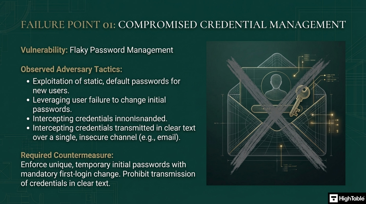 This usual things here that go wrong are when people always use the same default passwords for users. They set it and then the user doesn’t change it. Ideally set a new ‘starting’ password for each users. We see these then being shared over email or text in clear text. If you simply must do this then consider sending user names and passwords over different channels. If email gets compromised having the user name and passwords in emails means people have an easy hop then to breach your other systems.