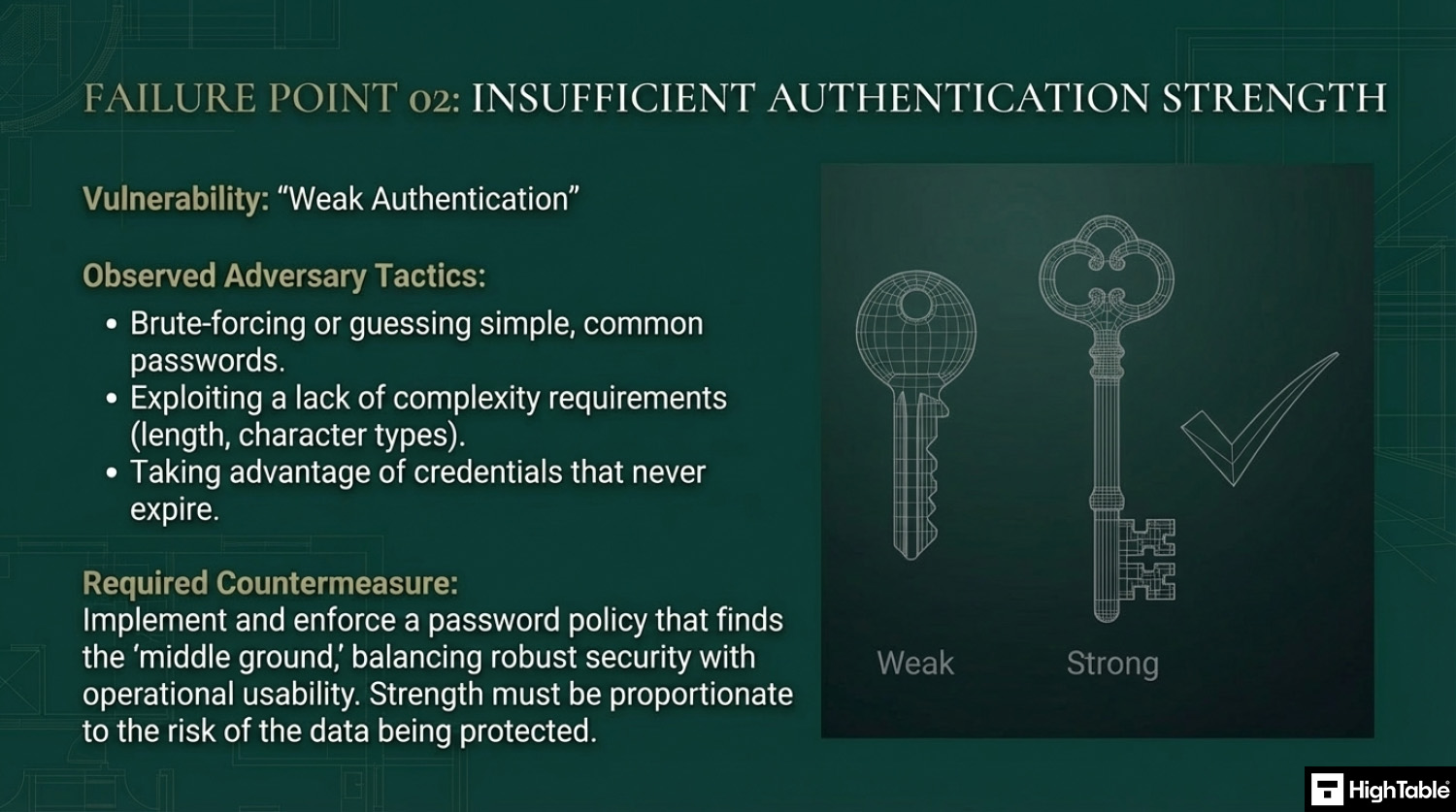 Having weak authentication, like little to no requirements on the type of password people use, means life is easy for everyone but these are also easy to compromise, breach, hack, guess. There has to be a balance. Having no passwords or easy default passwords that never expire is one approach but try to find a middle ground. If you are not NASA then bio metrics maybe overkill, I get it. Be sure to have something.