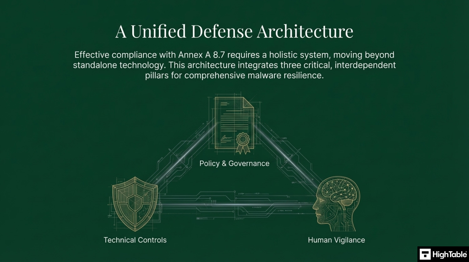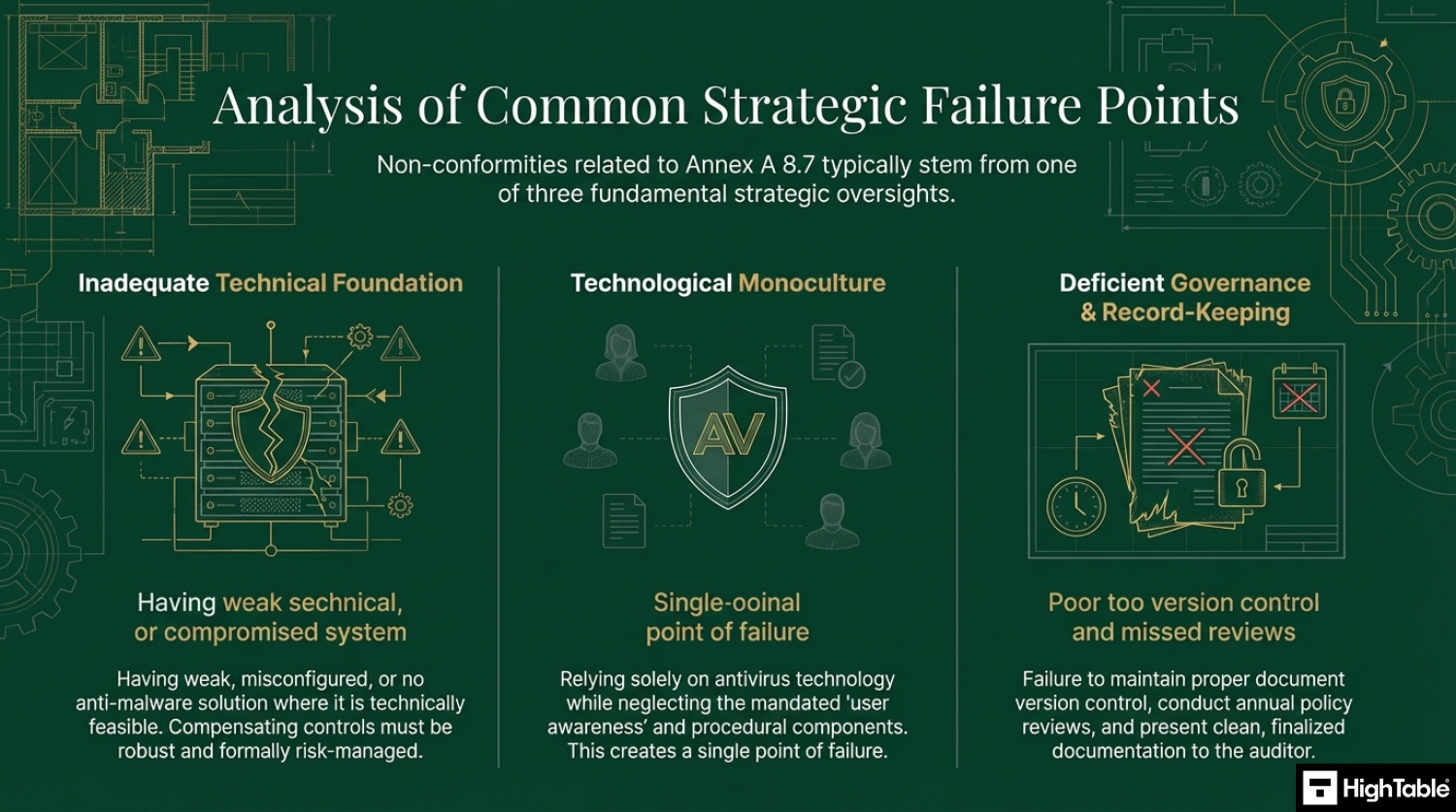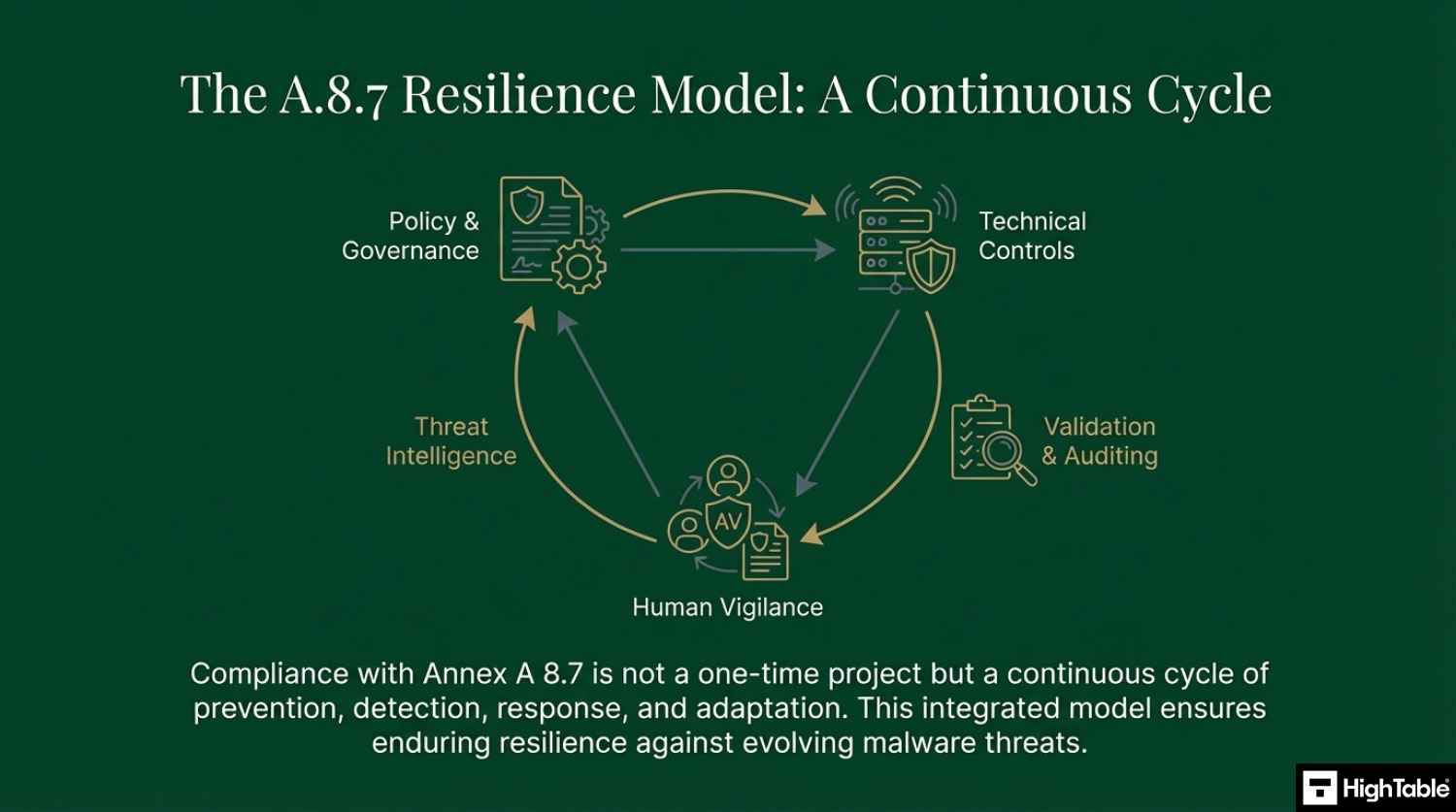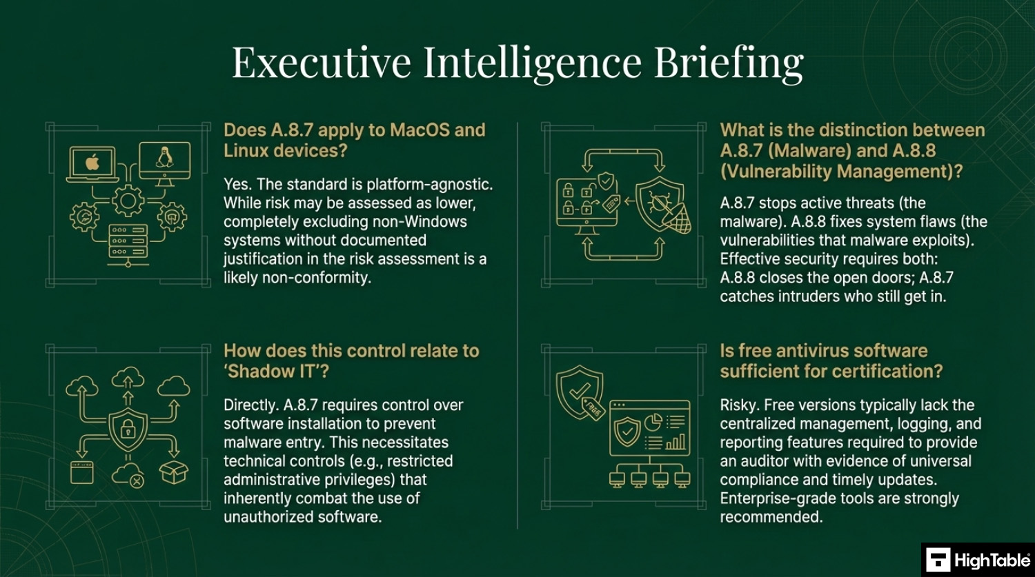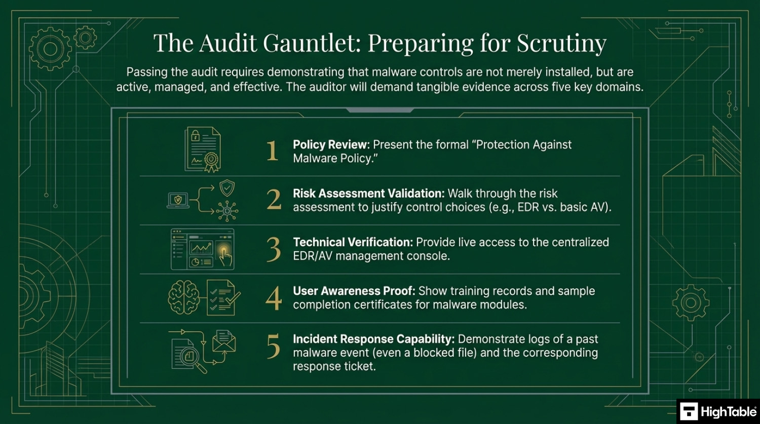 To pass the audit for Annex A 8.7, you must demonstrate to the auditor that your malware controls are not just installed, but active, managed, and effective. Use this checklist to prepare your evidence: