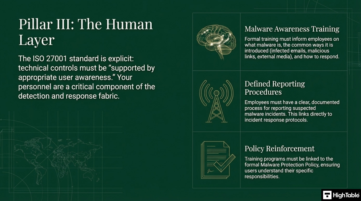 Navigating the requirements of ISO 27001 Annex A 8.7 goes beyond simply installing antivirus software; it requires a holistic approach that links policy, technical controls, and human behaviour. To help you visualise the complete compliance landscape, the mind map below breaks down the control into five actionable pillars, ranging from the initial scope definition to the ongoing audit process.