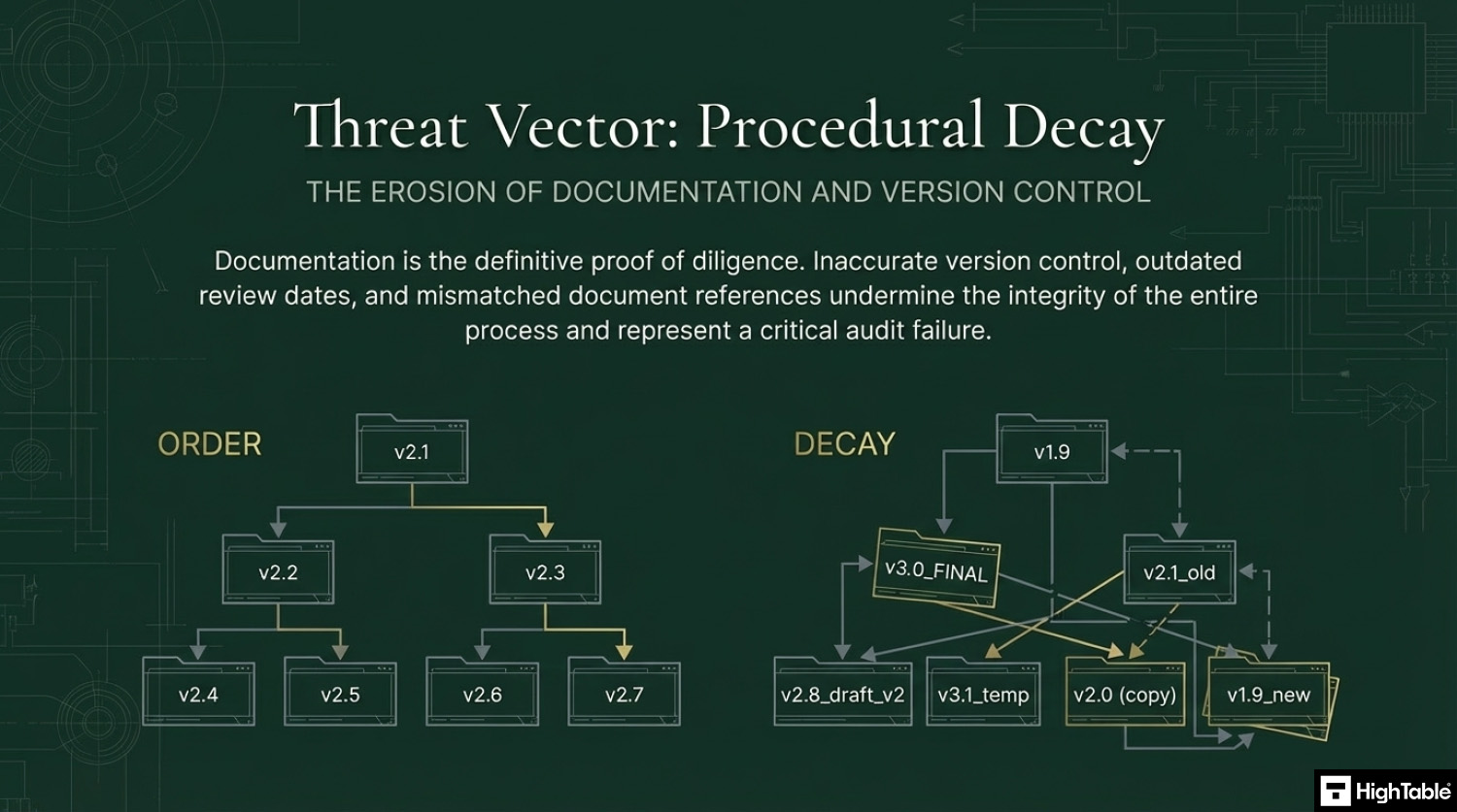 Keeping your document version control up to date, making sure that version numbers match where used, having a review evidenced in the last 12 months, having documents that have no comments in are all good practices.