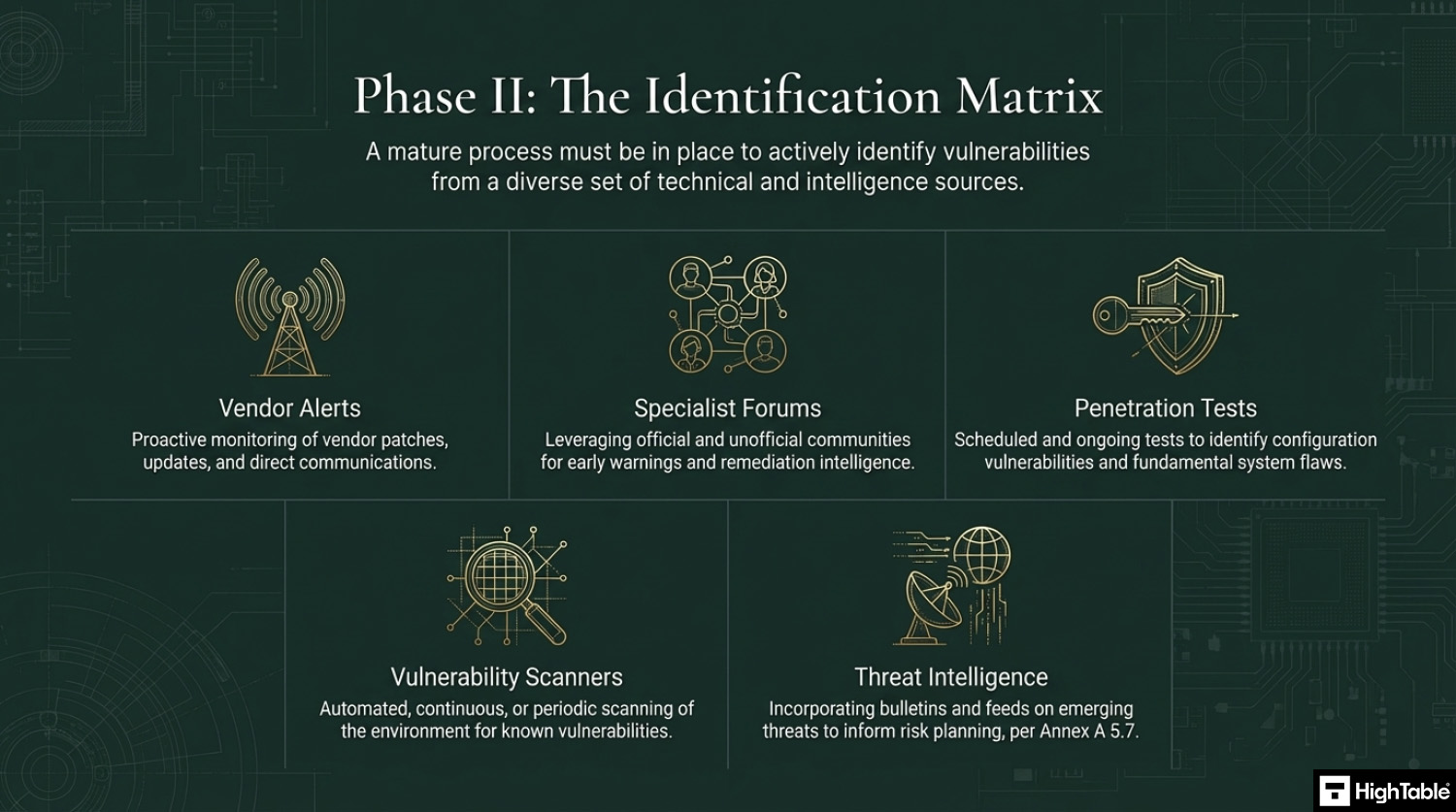 Put in place the ability to identify vulnerabilities. Examples include using threat intelligence, vulnerability scanners, penetration tests, being part of specialist groups and forums and vendor newsletters and alerts.