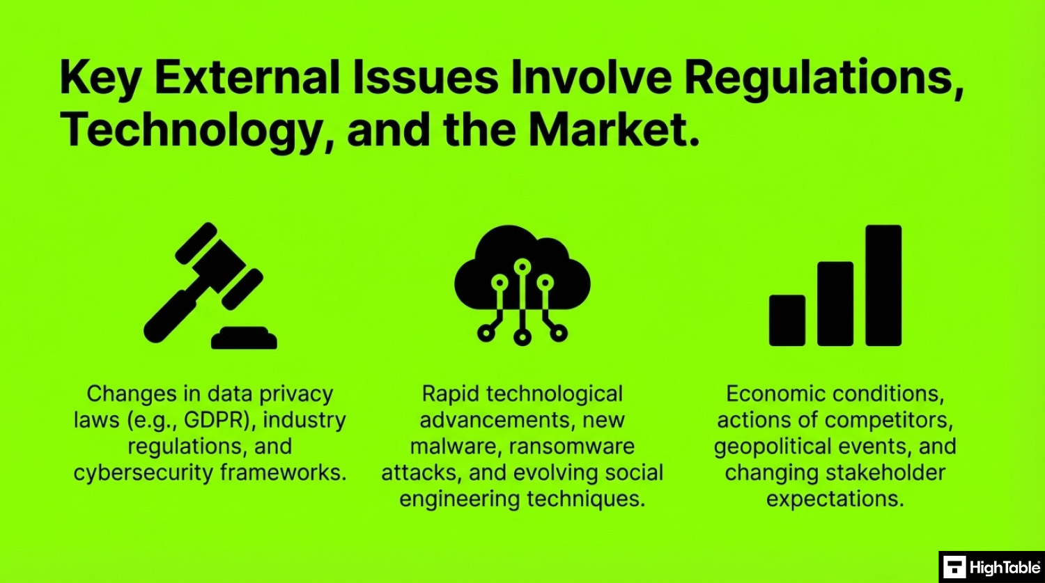 External Issues are inherent risks originating outside an organisation that can hinder the effective functioning of its Information Security Management System (ISMS). These external risks, primarily outside the organisation’s control, can impede the ISMS from achieving its objectives, particularly in safeguarding the confidentiality, integrity, and availability of information assets.