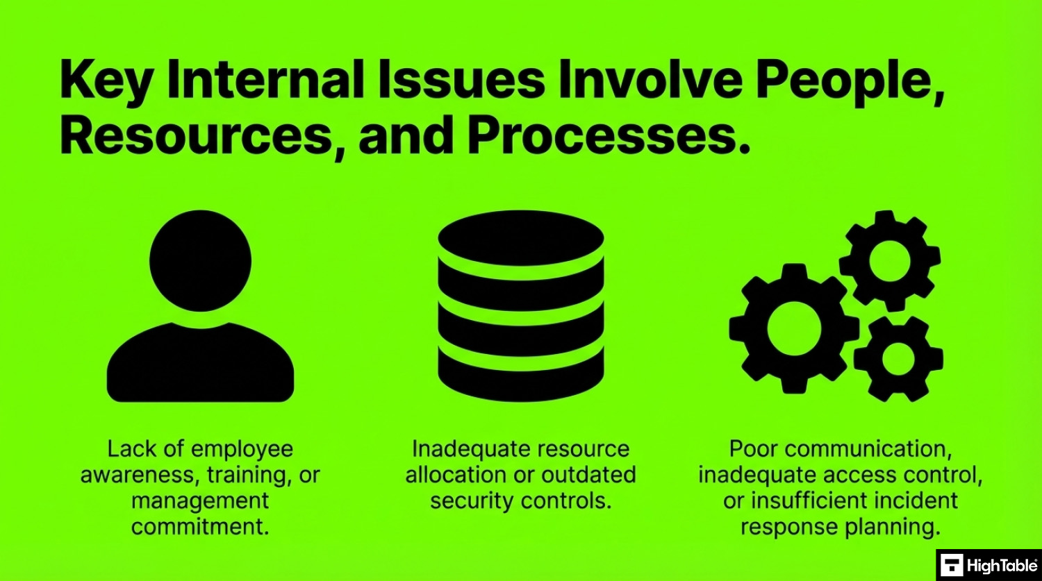 Internal issues originate within the organisation itself, such as lack of management commitment, inadequate resource allocation, or resistance to change.