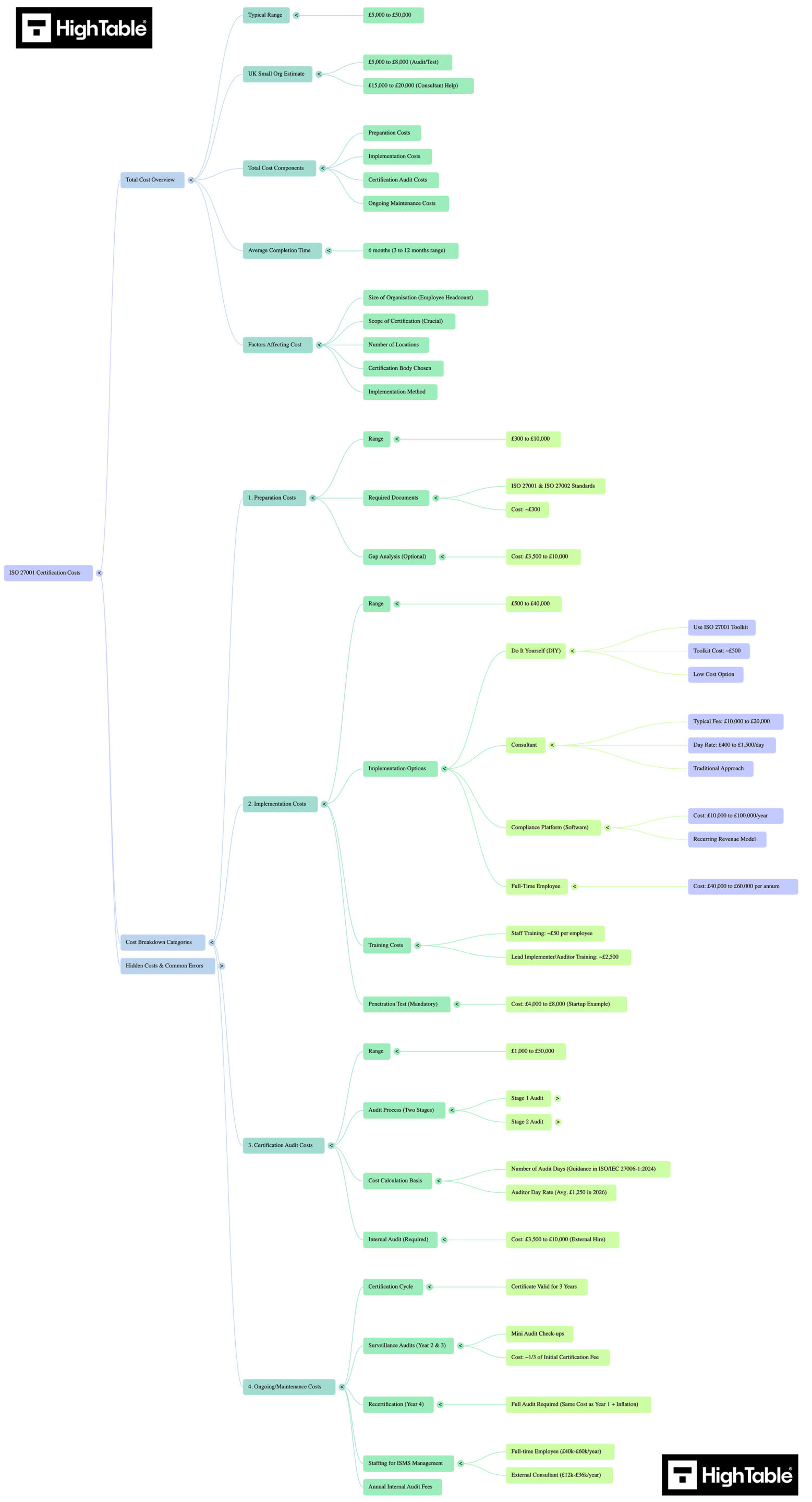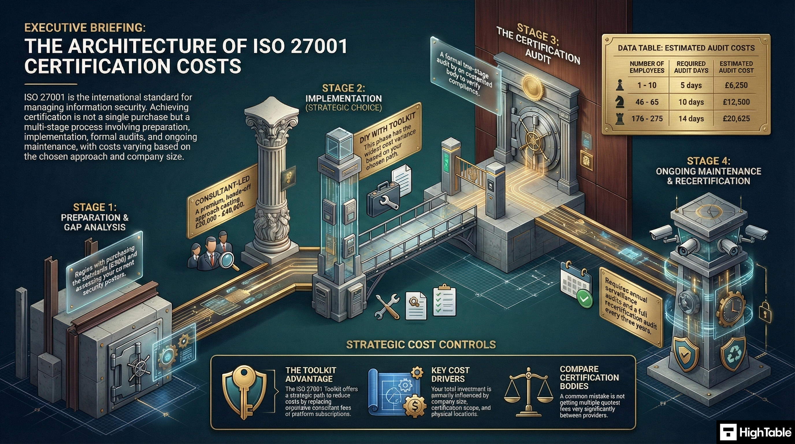 The cost of ISO 27001 certification varies significantly based on organization size and complexity, but typically falls into three buckets: Implementation Costs (£5k – £60k), Stage 1 & 2 Audit Fees (£6k – £12k), and Maintenance Costs (£3k+/year).