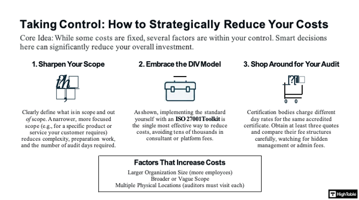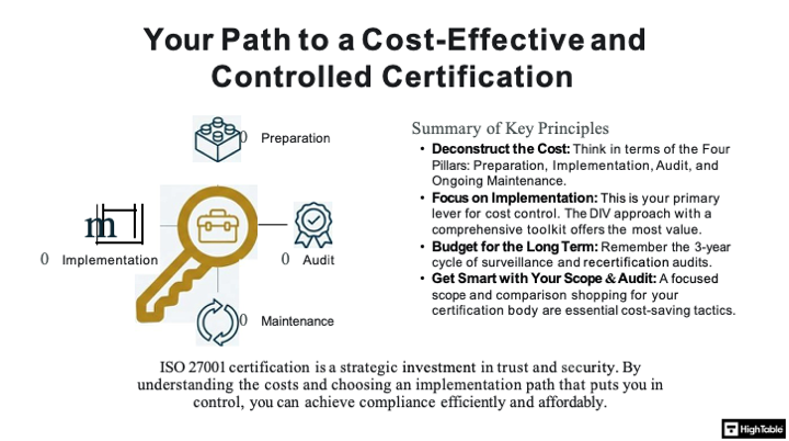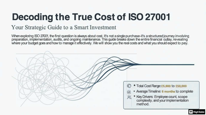 Understanding the price of certification requires looking beyond the quote from the certification body. The following briefing slides deconstruct the Total Cost of Ownership (TCO) for an ISO 27001 project, breaking down the mandatory audit fees, the variable implementation costs, and the hidden maintenance expenses.