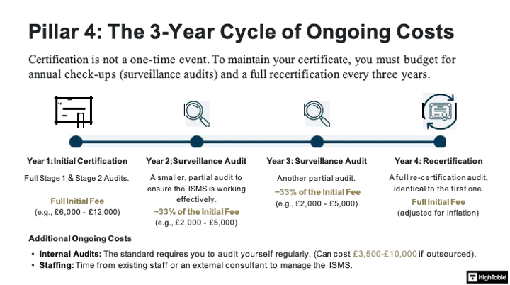ISO 27001 is not a “one-and-done” achievement. You must budget for annual Surveillance Audits, which typically cost 33-50% of the initial certification fee. Additionally, you must factor in annual penetration testing and ongoing staff training tools.