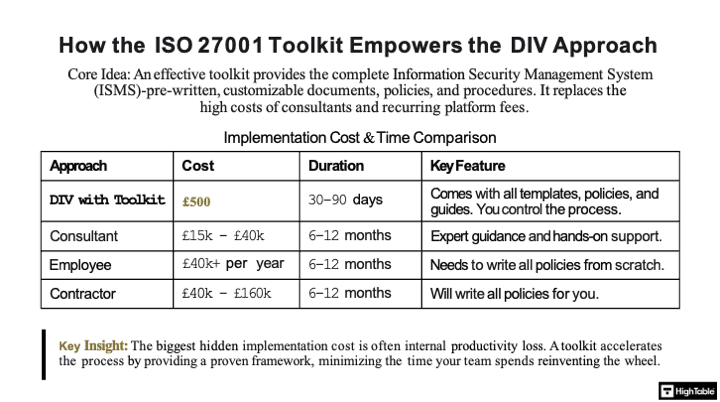 It is easy to see that the cost of doing it with the ISO 27001 toolkit is the most affordable and strategic choice.