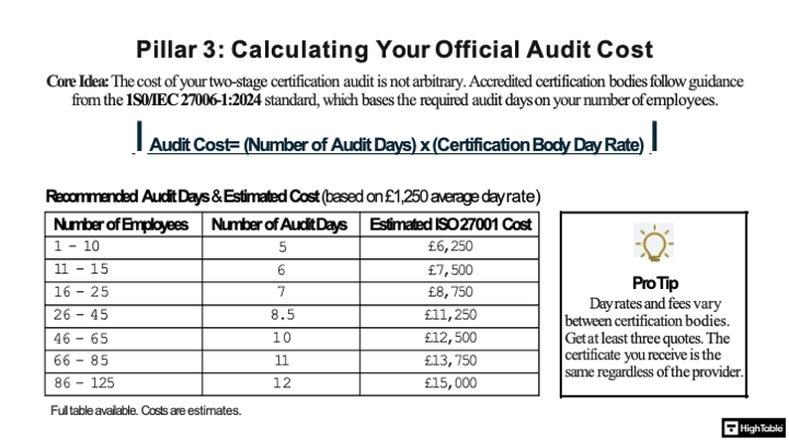 The Math: A 50-person company typically requires 6–8 audit days. At an average rate of £1,100/day, your base fee is mathematically fixed.