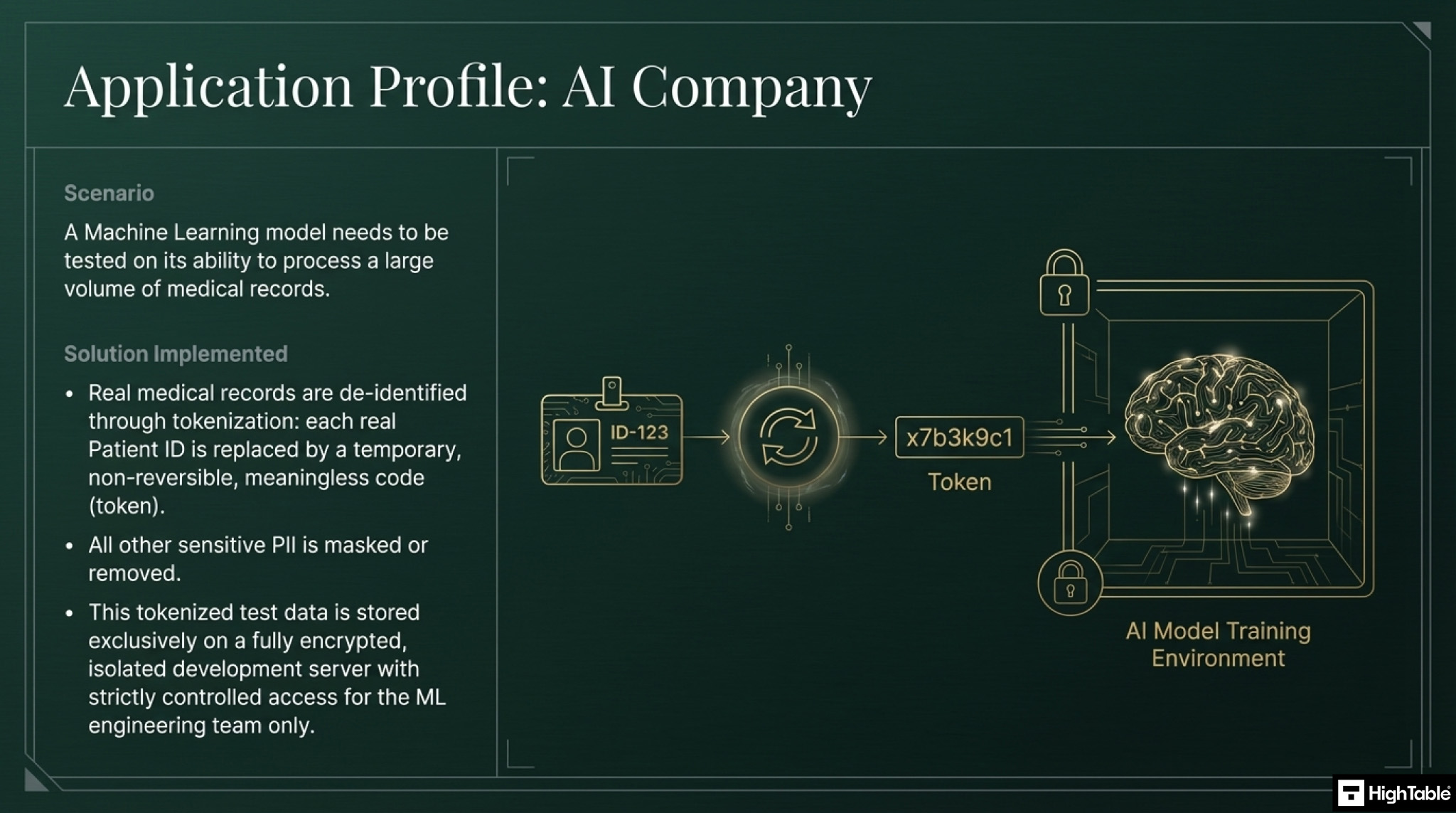 A Machine Learning engineer needs to test a new AI model’s ability to process medical records. The engineer uses a de-identified and tokenised version of the medical records (each real patient ID is replaced by a temporary, meaningless code). This test data is stored only on an encrypted development server.