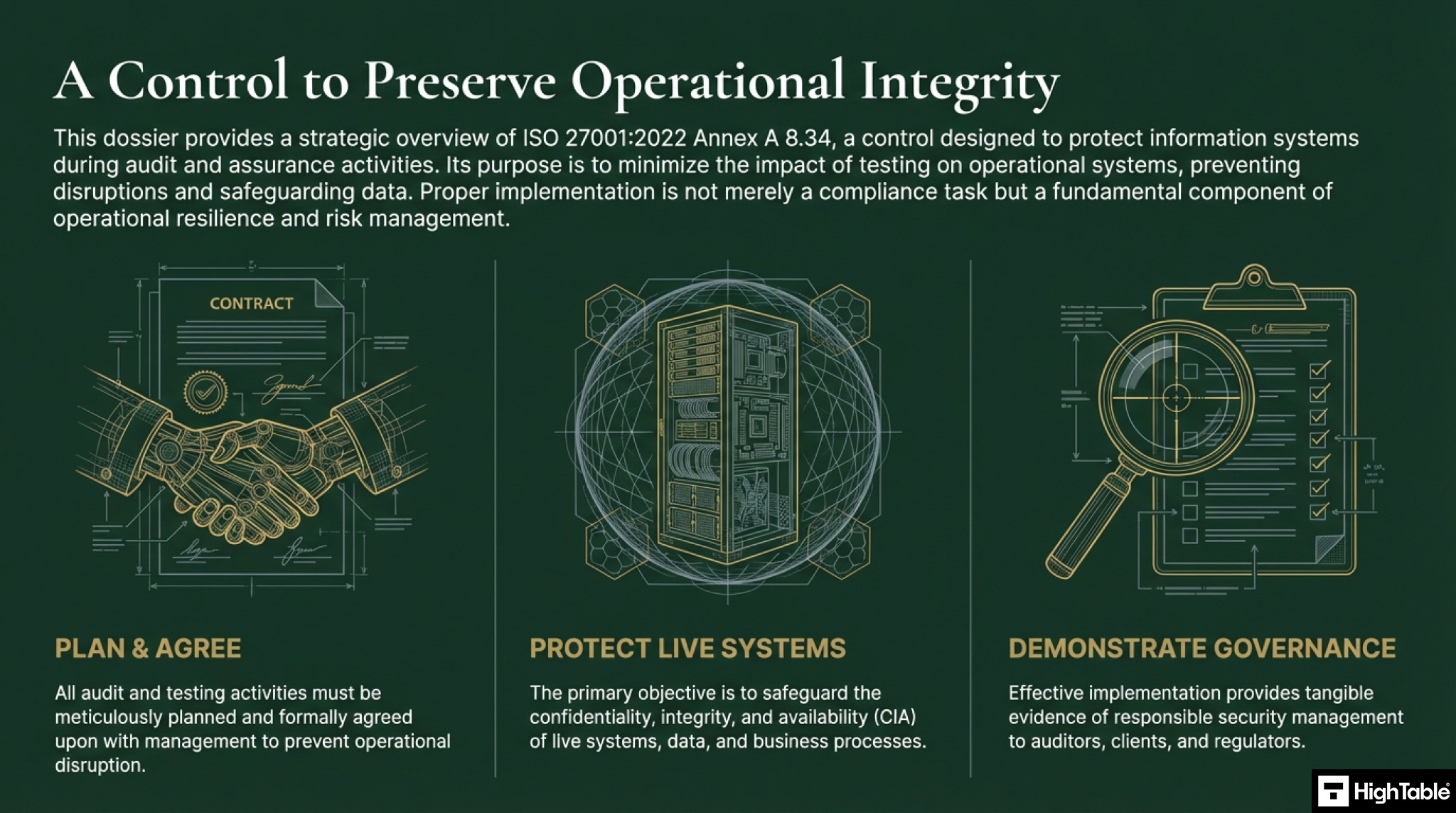 The primary objective of Annex A 8.34 is to prevent audit testing activities from disrupting operational business processes. It mandates that audit tests be planned, authorised, and controlled to minimise the risk of system downtime or data corruption. Specifically, this control ensures that access to operational systems during an audit is limited, monitored, and agreed upon with asset owners before any testing begins.