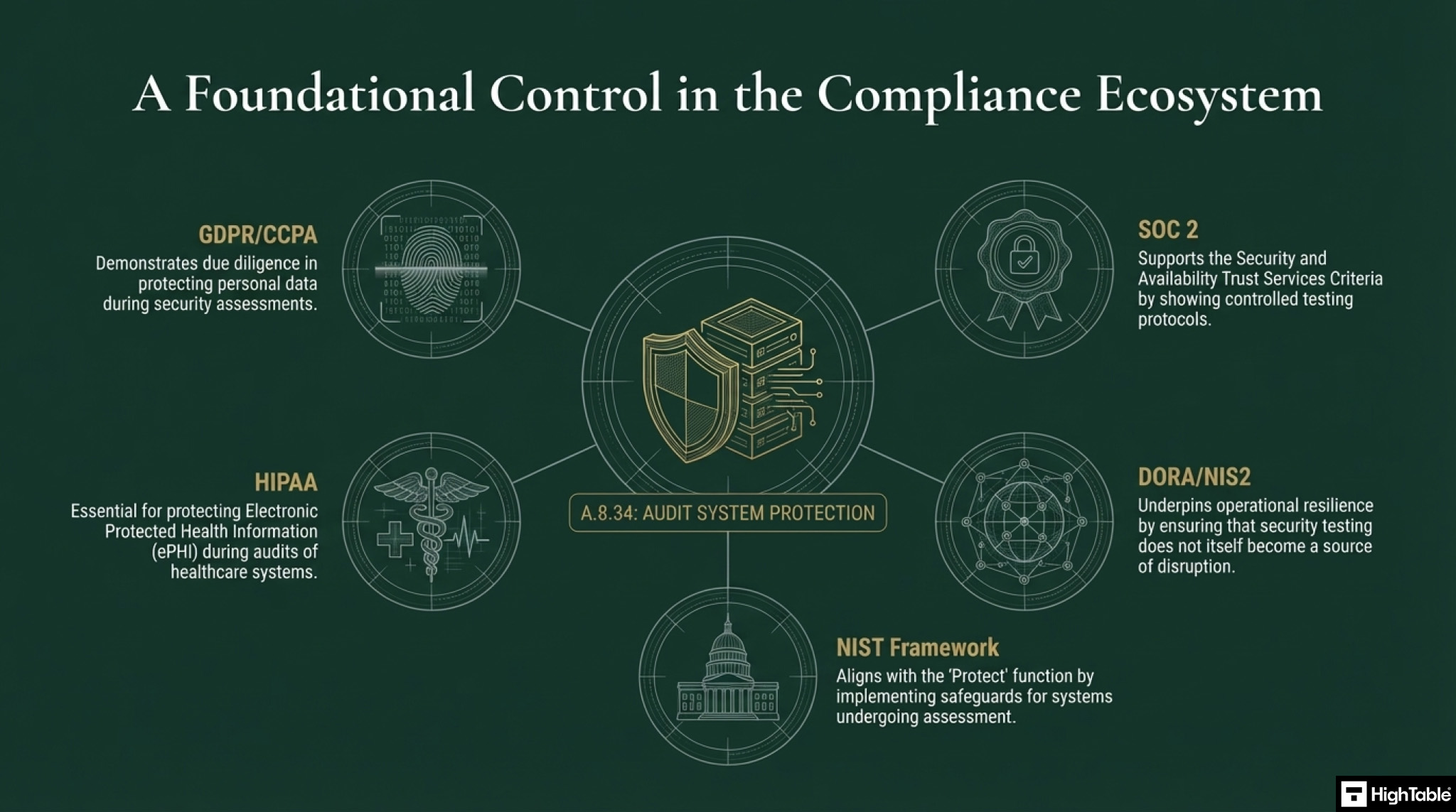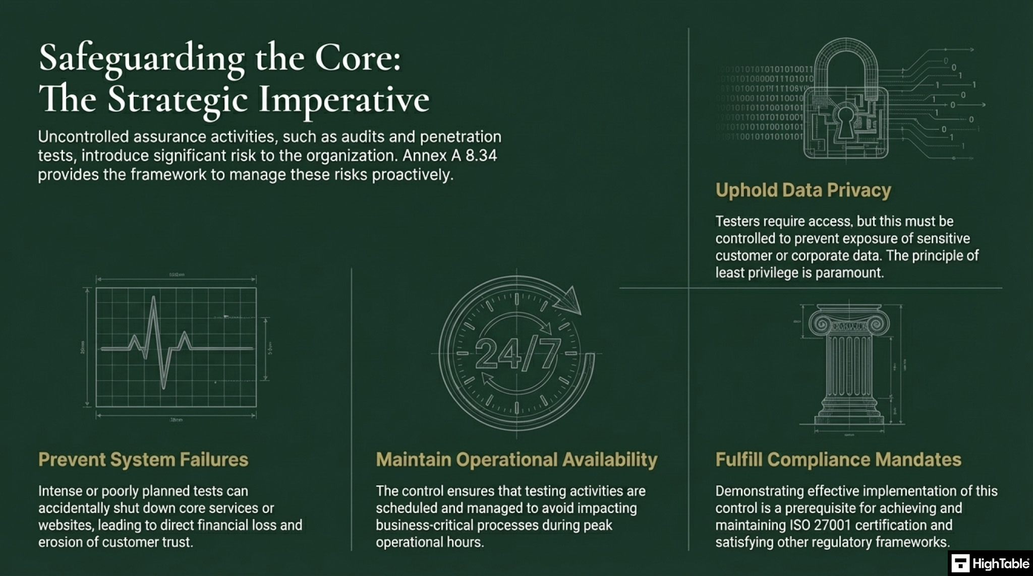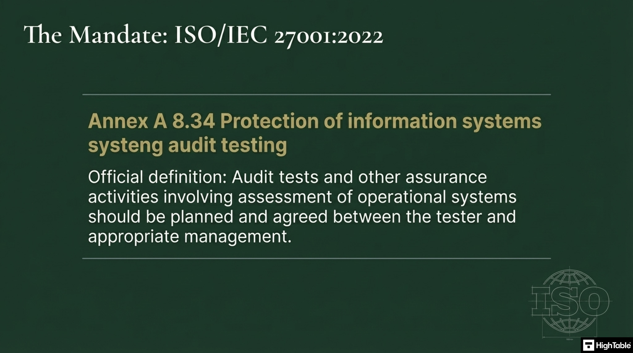 ISO 27001 Annex A 8.34 is a preventive control designed to ensure that security audits and technical tests (like penetration testing) do not accidentally break the very systems they are meant to protect. It mandates that all audit activities are carefully planned, agreed upon, and monitored to prevent operational downtime or data leaks.