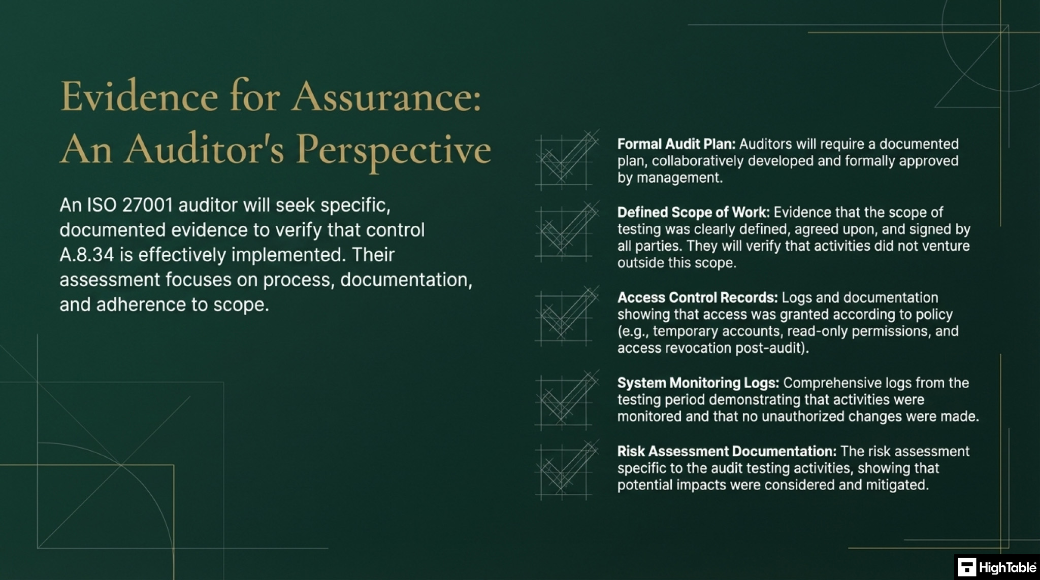 Auditing ISO 27001 Annex A 8.34 requires a forensic review of how security assessments are planned, authorised, and monitored. Use this audit protocol to verify that technical testing activities were conducted without compromising system availability or integrity.