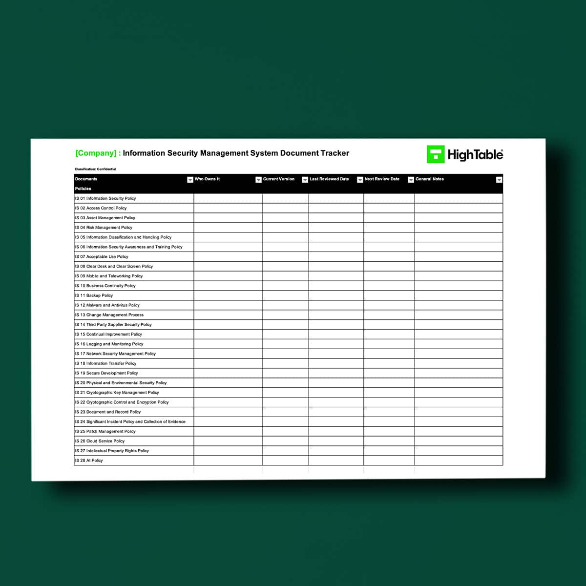 The Information Security Management System (ISMS) is made up of a number of ISO 27001 templates so having a tracker is a great admin tool to track who in the business owns what document, what the current version of a document is, where it is located, when it was last reviewed and the current version.